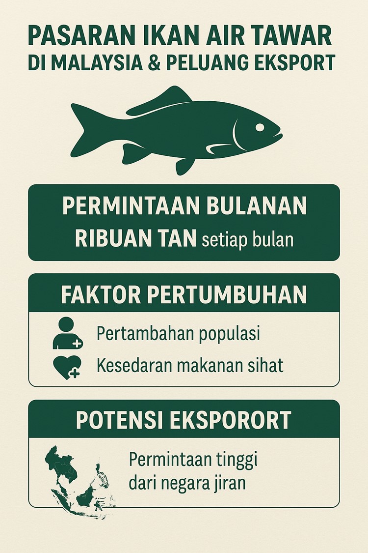 Menurut data industri, Malaysia memerlukan ribuan tan ikan air tawar setiap bulan, dan angka ini terus meningkat seiring pertumbuhan penduduk serta kesedaran masyarakat terhadap sumber protein segar yang lebih sihat.